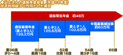 山上さんのご家庭の場合、ご主人に万一のことがあった場合には、遺族厚生年金と遺族基礎年金(末子が高校を卒業するまで)が支払われます。このうち、遺族厚生年金は社会保険の加入額によって増減します。例えば、平均月収(年収を12で割った額)が20万円の場合、遺族厚生年金は約30万円、平均月収30万円なら約48万円です。