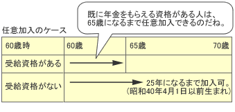 国民年金は60歳以後も任意加入できます。60歳時で国民年金の受給資格の25年を満たしている人は、65歳になるまで任意加入して年金額を増やせます。60歳時で受給資格を満たしていない人は、70歳になるまでに25年になるまで加入して受給資格をつくれます。今回は、既に受給資格はあるが、任意加入して年金額を増やしたいケースで考えてみましょう。