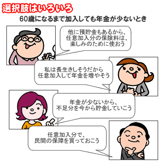 ただ、60歳から国民年金に任意加入すれば65歳からの年金額は増えますが、増えた年金額を受けられるのは長生きが前提です。60歳以後年間約17万円(平成20年度)の保険料の支払いはかなり大変です。60歳までに受給資格を満たせる人なら、老後の不安と年金不足を補うために、今から少しずつ貯金する、投資する、または保障を買って備えるのもよいでしょう。